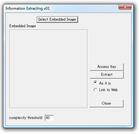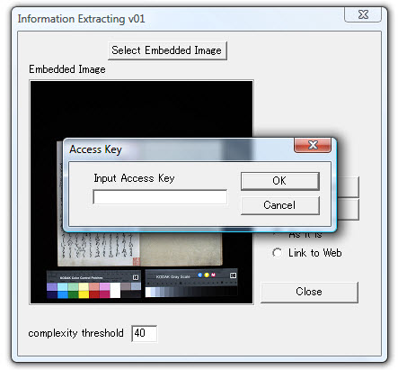 BPCS Steganography The extraction process requires that the complexity threshold be set to exactly the same value as was employed for embedding. While this might be considered an inconvenience, it is to be expected when using steganography: extraction always requires some prior knowledge of how the embedded data was encoded. It can also serve as sort of password, preventing casual access by those without permission (the CT value would only be sent to researchers who have been granted access). Generally speaking there are two approaches to steganography using image documents: image domain and transform domain. Image domain (or "bit-wise") tools such as Steganos manipulate the LSB of the cover image, replacing random noise with data. Transform domain software such as Digimarc, use DCT and wavelet transformations (like those employed for JPEG and JPEG2000) to embed a payload. Invisible watermarking, to conceal copyright and other information, is a type of steganography in which "survivability" is a key quality. Transform domain manipulation is more robust than LSB modification. When bit-wise steganography has been used to modify the LSB, the resulting file tends to have a different noise profile to others of a similar type. Statistical analysis of noise floor consistency and comparison with other files form the basis of the developing science of steganalysis. This field has grown in importance with the "war on terror", but while steganalysis may reveal the "fingerprint" or likely presence of embedded data, it is highly unlikely that it can actually find the data, especially if it has been encrypted. This, it must be stressed, is not a concern of the ADIEUX Project since the presence of the payload is not hidden; on the contrary, the payload is advertised in the metadata of the cover image. Organizations using steganalysis may decide that it is enough to destroy a suspected payload. Almost any editing of the image data, especially at the LSB level, is likely to render impossible the recovery of the embedded data. In the case of the ADIEUX Project, however, this can be seen as an advantage: any tampering with a portmanteau file is detectable. This essential "fragility" provides a way to confirm the integrity of an archival portmanteau. Returning to the Qtech-Hide&View application, the extraction process begins with selecting the portmanteau: